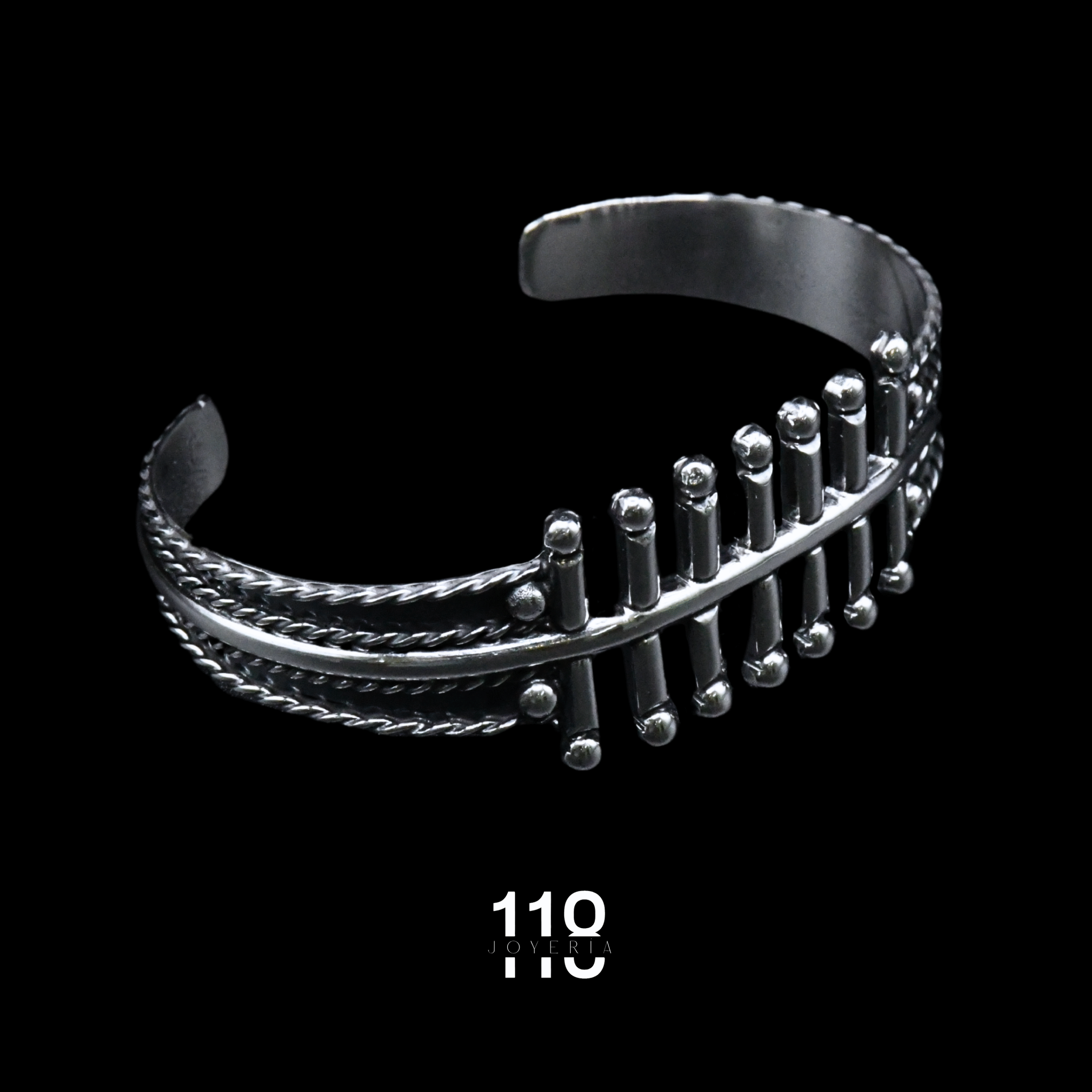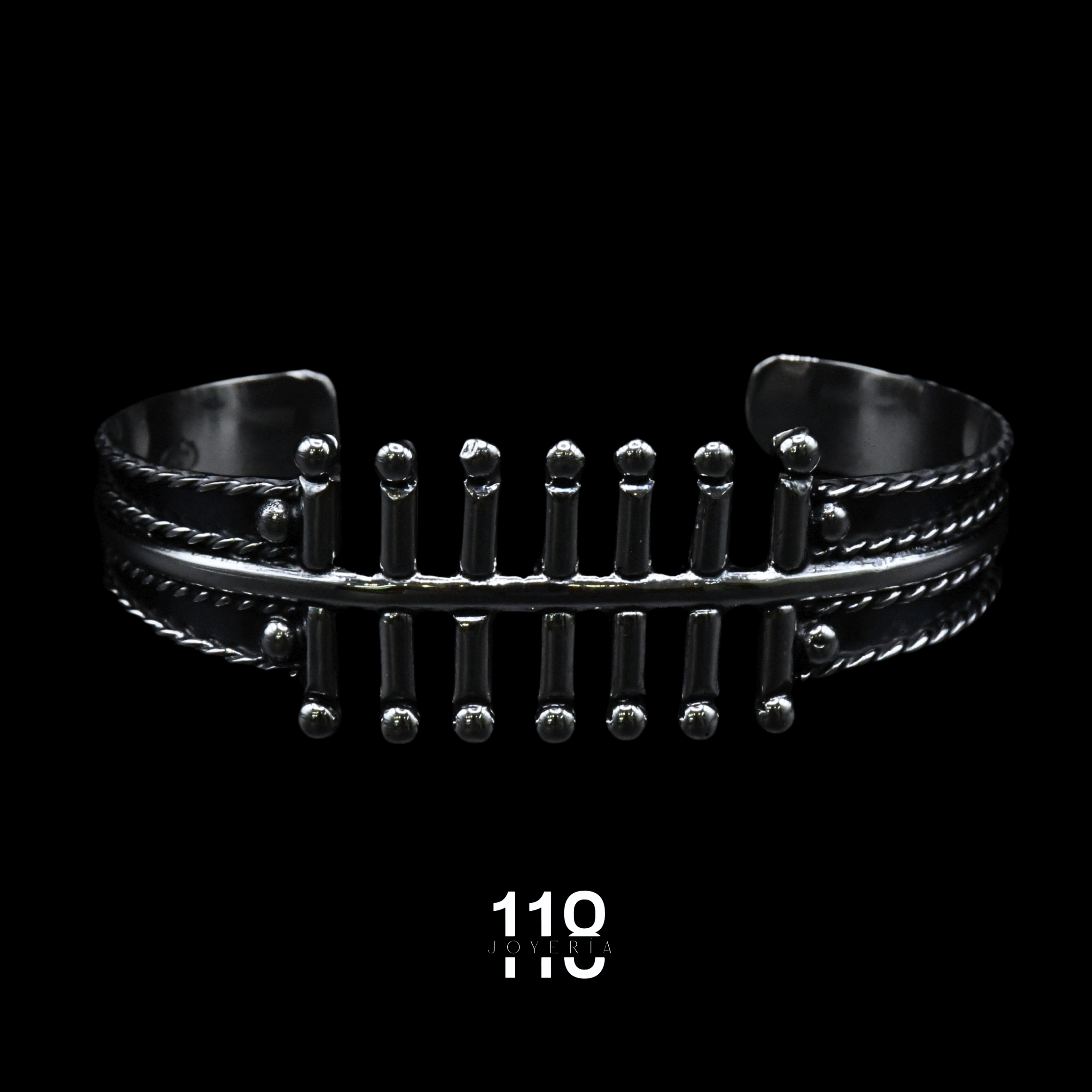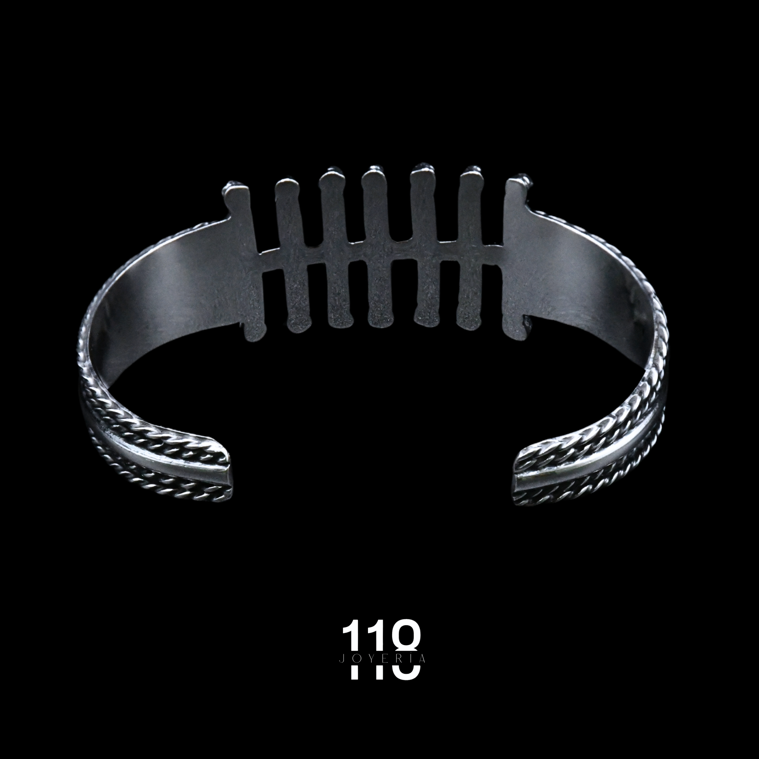 Brazalete rígido elaborado en plata ley .925 con acabado oxidado que resalta su carácter rústico y artesanal. Su diseño presenta siete barrotes verticales al frente, creando una estructura sólida y simétrica que transmite fuerza, orden y estilo. Una pieza con presencia marcada, ideal para quienes buscan un accesorio distinto, con textura, profundidad y personalidad.